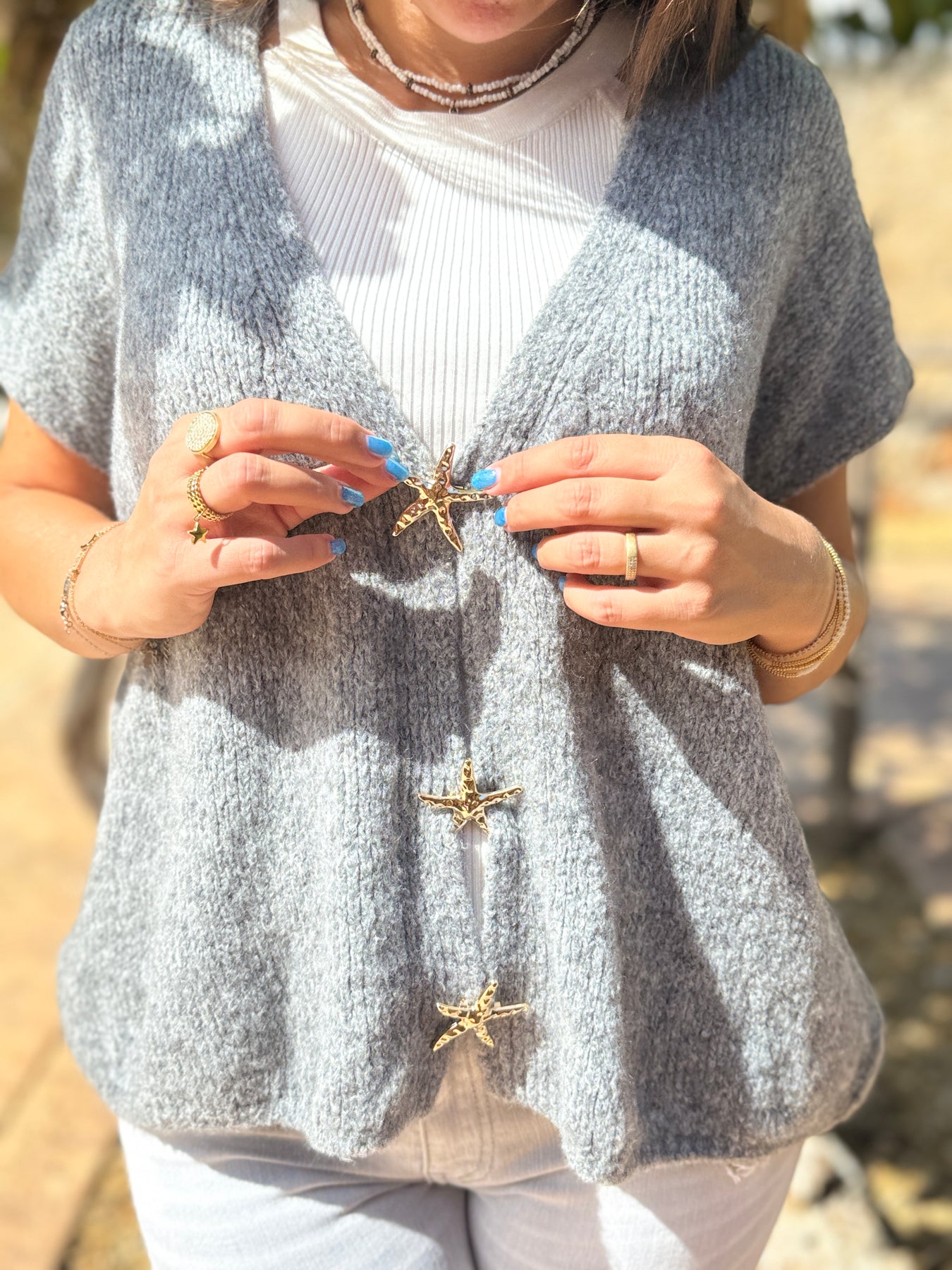 Craquez pour ce gilet sans manches en maille grise, orné de magnifiques broches étoiles amovibles dorées qui apportent une touche élégante et tendance à toutes vos tenues. Sa coupe ample et confortable s’adapte à toutes les morphologies.