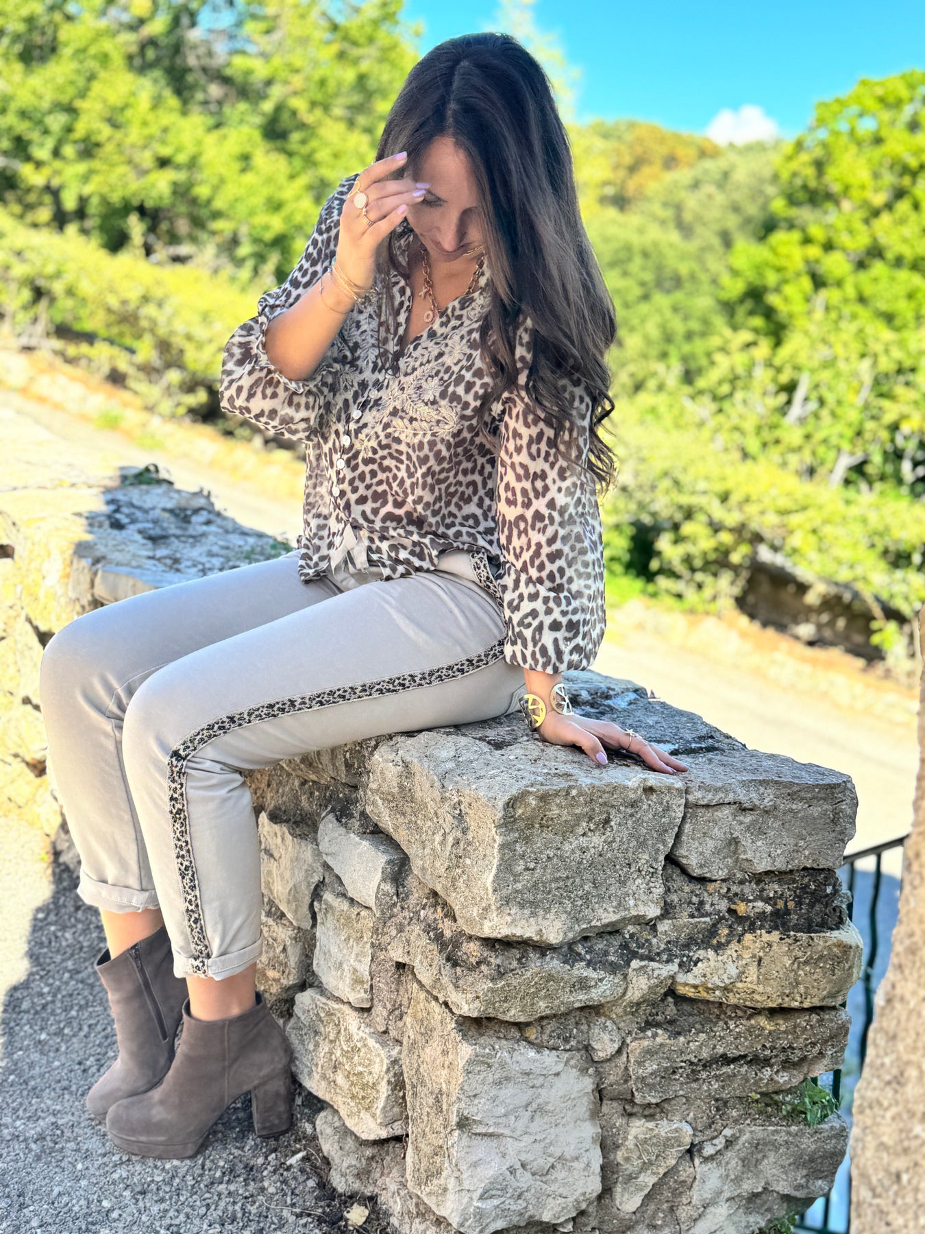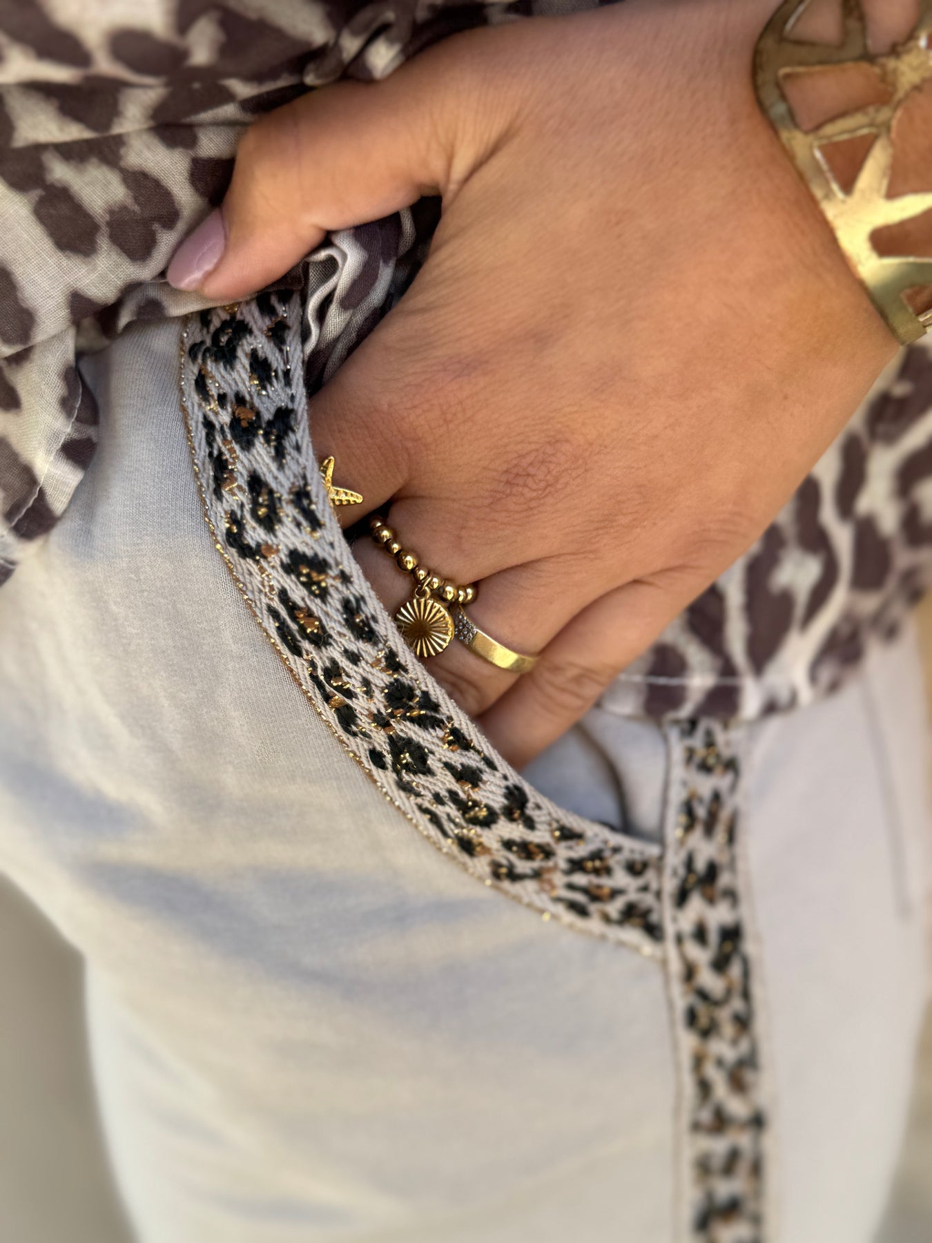 Alliez confort et tendance avec ce jogger beige à détail léopard, une pièce incontournable pour vos looks casual chic.