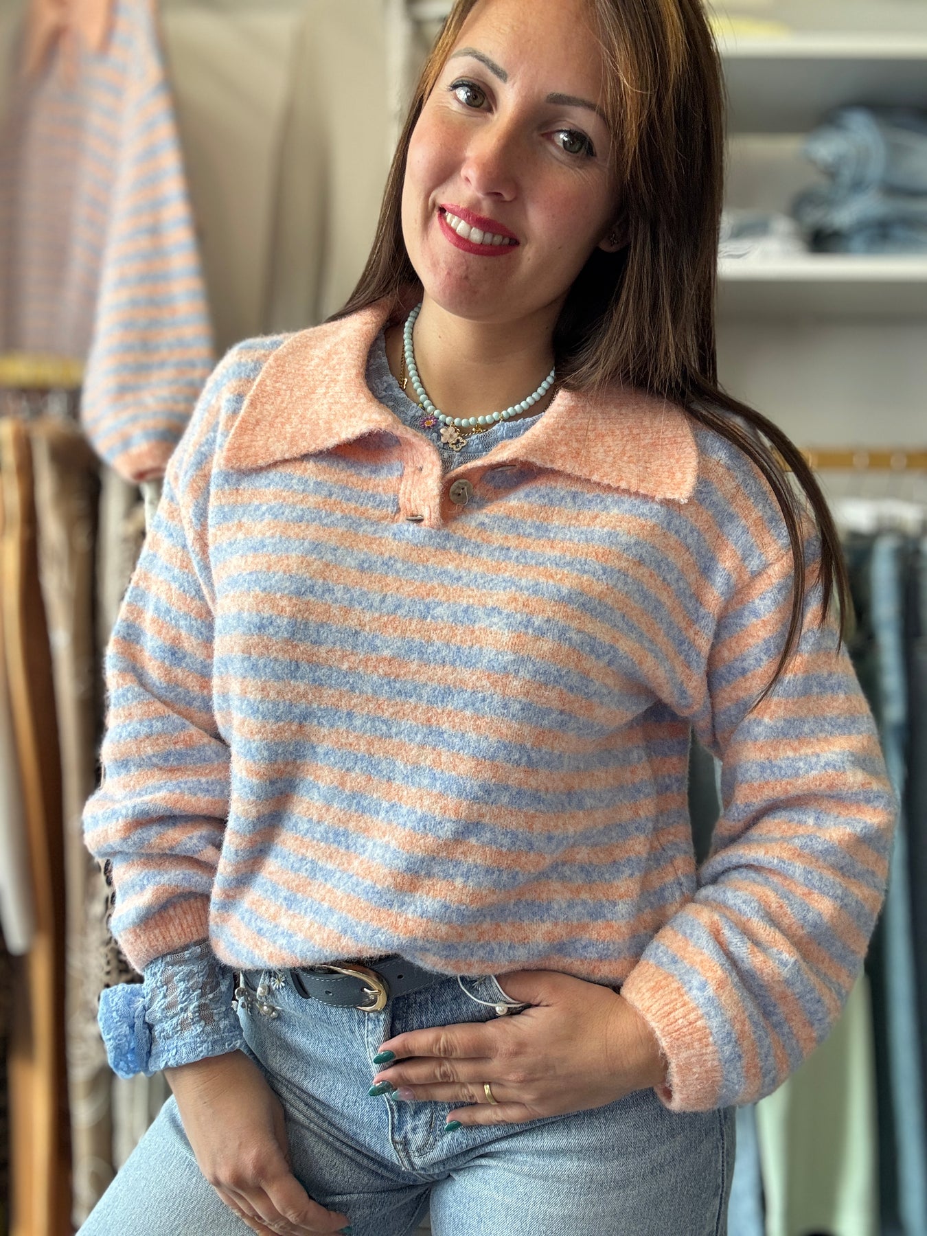 Avec ses rayures pastel rose et jaune et son col polo tendance, il allie confort et style pour un rendu casual chic au quotidien.