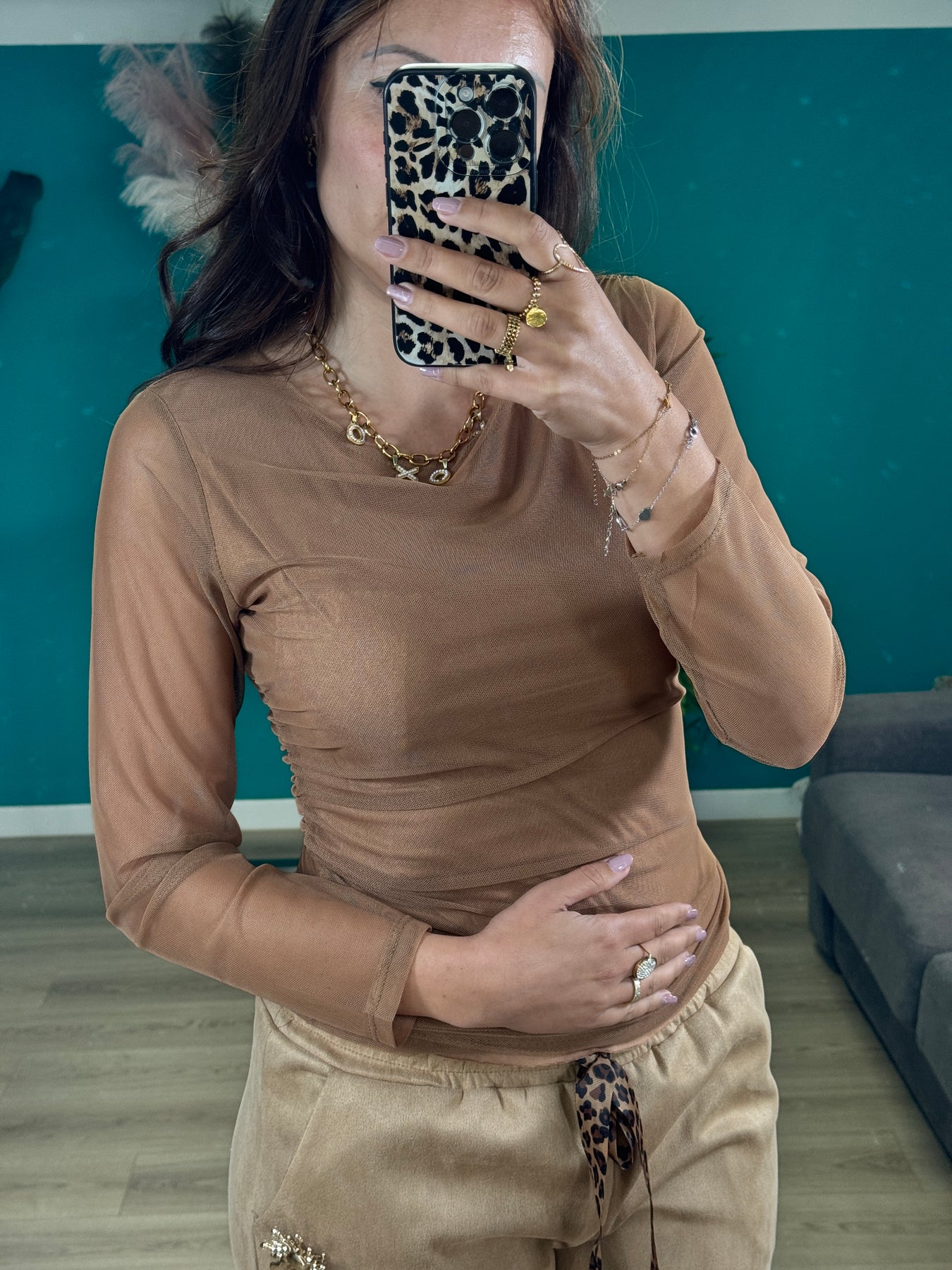 Haut beige en résille doublé – manches transparentes Sarah chocolat